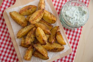 Kartoffeln abwaschen, mit einer Bürste gründlich reinigen, trocknen und in Spalten teilen. 2 EL Olivenöl, 1 TL Salz, 1 Prise Paprika und 1 Prise Kreuzkümmel vermischen. Kartoffelspalten mit dem gewürzten Öl mischen.