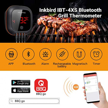 ★【Temperaturbereich】Der Inkbird IBT-4XS Grillthermometer Fühler- und Drahttemperaturbereich beträgt 0 ℃ ~ 300 ℃. is zu 150 Fuß / 50M Signal im Freien(Der Temperaturereich für kontinuierliche Messungen geht von 0 bis 250°C. Kurzzeitige Extremwerte im Bereich von 0 bis 300°C werden unterstützt.). Sondenlänge: ca. 150cm., ★【Magnetischer Entwurf】Das magnetische Design auf der Rückseite des bratenthermometer könnte am Smoker oder Grill etc angebracht werden. Ein weiteres erstaunliches Design ist, dass die LED-Anzeige durch doppeltes Antippen der Einschalttaste gedreht werden kann. Sie können den Temperaturwert auf jeder Seite lesen., ★【Umweltfreundlich】 Dieses Fleischthermometer hat einen eingebauten 1000mAh Lithium-Batterie und kommt mit 50cm USB-Ladekabel. Die volle Ladekapazität kann 60 Stunden halten. Die Batteriekapazität kann über APP überwacht werden. Sehr wirtschaftlich, langlebig, effektiv und umweltfreundlich., ★【Alarm】 Wenn Temperatur erreicht, Ausschalten oder Verbindung verlieren usw. Voreinstellwerte werden beim Ausschalten gespeichert., ★【Inkbird Cares】 Inkbird batteriebetriebenes digitales grillthermometer bluetooth ist ein BBQ-Muss in jeder Küche entweder professionell oder nicht. Da Ihre Zufriedenheit unsere oberste Priorität hat, wird dieses Produkt durch unsere Cares von 12 Monaten unterstützt, falls Sie Probleme damit haben. Holen Sie sich noch heute unser neues Inkbird Thermometer.WEEE Reg Nr. DE 31070039
